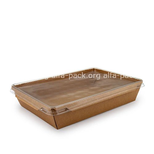 Крафтовий контейнер з пластиковою кришкою — одноразовий посуд для сервірування та подачі гарячих і холодних страв. Внутрішня поверхня повністю ламінована, що запобігає протіканню та забезпечує зручність у використанні.