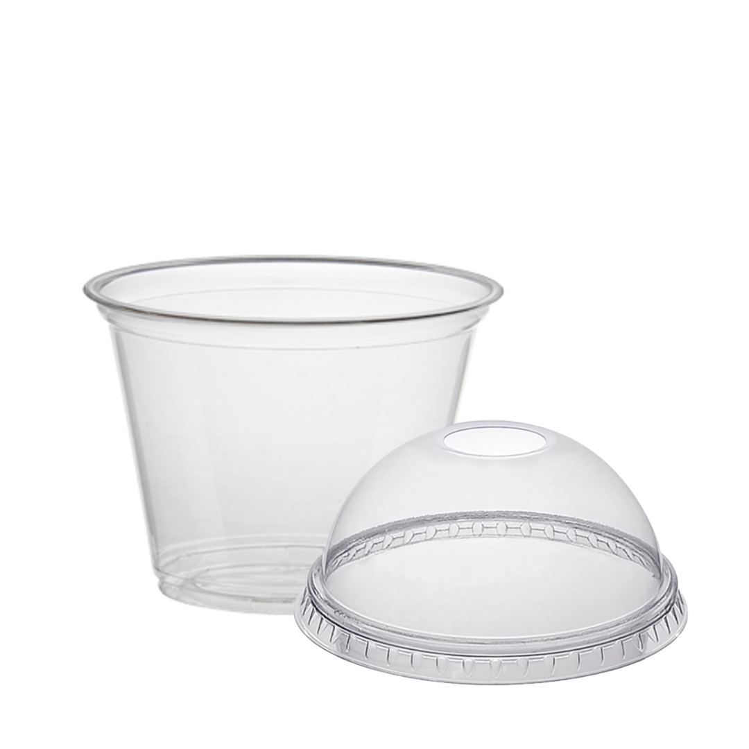 Прозорий ПЕТ стакан у комплекті з купольною кришкою  з отвором. Підходить для коктейлів, смузі, та інших напоїв і продуктів на виніс. Практичне рішення для кафе, кав’ярень, фудкортів і доставки.