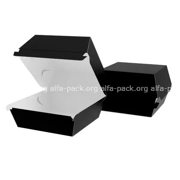 Картонная коробка для упаковки и подачи бургеров. Обеспечивает защиту продукции и подходит для фаст-фуда и доставки еды.