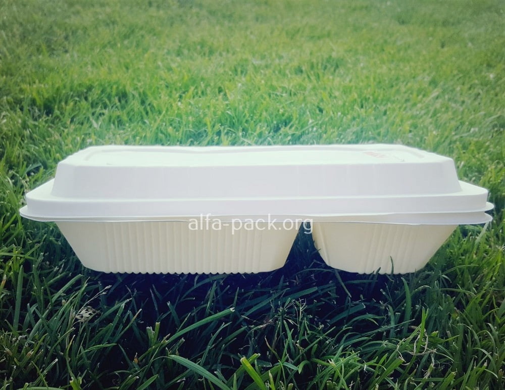 Ланч-бокс двухсекціонний- екологічно чистий одноразовий посуд на основі кукурудзяного крохмалю виглядає добре і його дуже приємно тримати в руках, і тим більше з неї їсти.