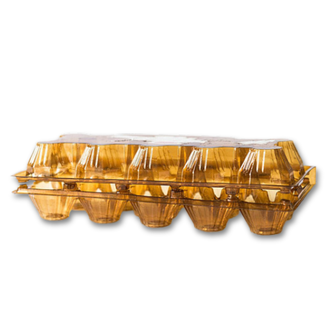 Надёжная и удобная коричневая пластиковая упаковка для хранения и транспортировки яиц. Обеспечивает защиту от повреждений и загрязнений.